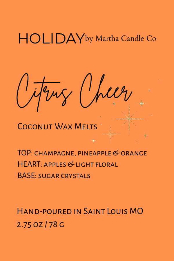 Elevate your holiday home with Citrus Cheer Wax Melts. Embrace the festive spirit with scents of champagne, citrus, sugar, apples, and light floral. Perfect for transitioning from Christmas to New Years, these melts will bring a touch of cheer to any room. (2.75oz / 78 g)