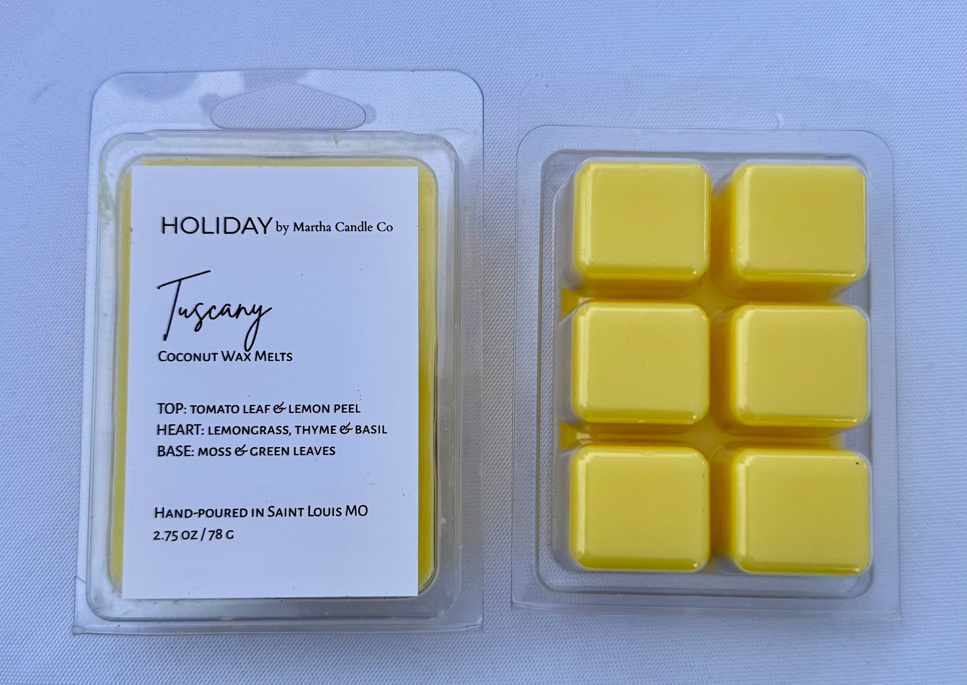 Experience the essence of Tuscany with our hand-poured wax melts, exclusively at Holiday. This enchanting fragrance offers complete sunshine with citrus and tomato leaf notes that rest on a heart of fresh summer herbs. The subtle base of green leaves and moss hints at an earthiness, making the scent green and herbal yet light, airy, and bright. (2.75oz/78g)